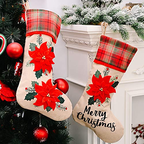 3 medias de Navidad de lino de flores rojas grandes, decoraciones de árboles de Navidad para reuniones familiares de vacaciones, decoración de calcetines Bolsas de regalo de dulces grandes
