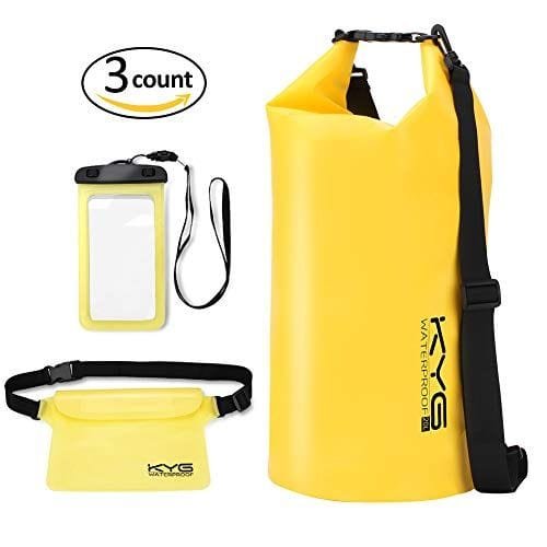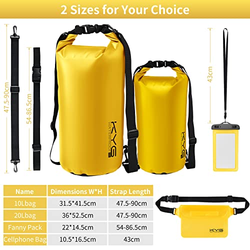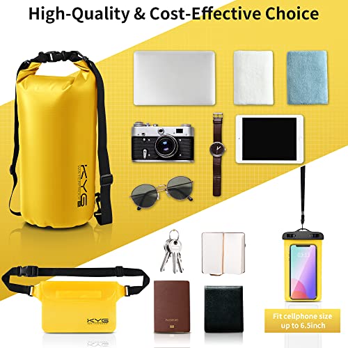 KYG Bolsa Estanca Impermeable 5L/10L/20L Set de Mochila Estanca con Funda de Móvil y Bolsa de Cintura, Bolsa Seca para Playa y Deportes al Aire Kayak Senderismo Esquí Pesca Escalada 20L Amarillo