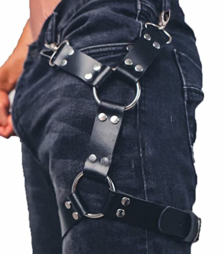 keland Arnés de Cuero Negro Punk Sexy Jaula Cinturón de ligadura de Muslo para Mujeres o Hombres (Negro-B)