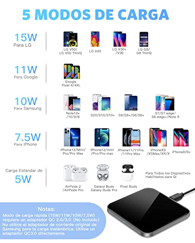 - ⚡【Gran Compatibilidad】:El modo de 7.5W es para iPhone 14/14 Pro/14 Pro Max/13/13 Pro/13 Pro Max/12/12 Pro/12 Pro Max/SE 2020/11/11 Pro/11Pro Max/XS/XS Max/XR /X/8 Plus/8, etc; El modo de 10W es para Samsung Galaxy S22/S22+/S21/S21+/S21, FE/S20/S20+/S20 Ultra/S10/S10+/S10E/S9/S9+/S8/S8Plus/S7/S7 Edge, Note 20/ 10/10+/9/8/5, etc. El modo de 5W para los teléfonos que soportan la carga inalámbrica. El adaptador no se incluye.