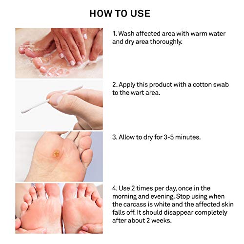 - Fácil de usar: viene con bastoncillos de algodón extra ya. Simplemente aplica nuestro removedor de verrugas con un hisopo de algodón en el área de la verruga dos veces al día y deja que se absorba completamente en la piel.