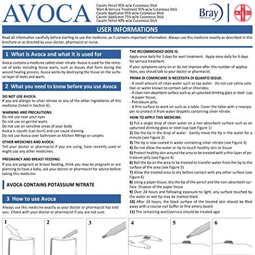- Producto comúnmente utilizado para la eliminación de puerros, verrugas, exceso de tejidos que se forman durante el proceso de cicatrización de heridas, tejido de granulación, mantenimiento del estoma, cepas umbilicales, cauterización, epistaxis anterior, rinitis vasomotora, necrosis cervical postbiótica , alivio del dolor para la estomatitis aftosa, sitios de alimentación parenteral. Avoca trabaja destruyendo el tejido en la capa superficial de puerros y verrugas