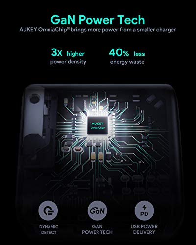 - 【 Chip Omnia GaN 】 carga más rápido tus dispositivos con cargadores más pequeños y livianos que los estándar. Los cargadores de la serie Omnia de AUKEY son los cargadores PD más pequeños del mundo. A través de la tecnología GaNFast de nitruro de galio (GaN), líder en la industria, podrás cargar a alta potencia tu teléfono y ordenador portátil con un producto del tamaño de un cargador de teléfono estándar
