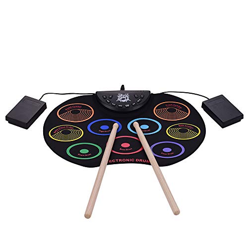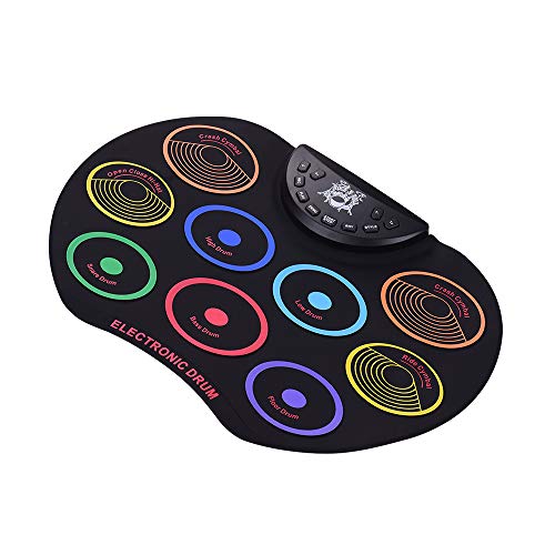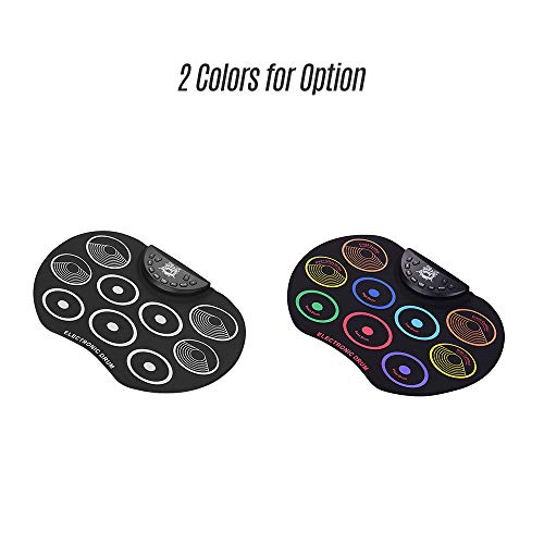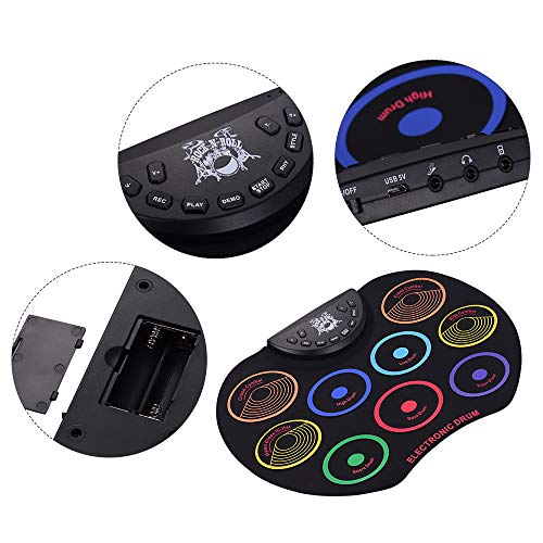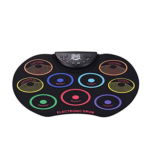 - ♫ 9 en 1 Tabletop Drum Pad: 9 pads sensibles a la velocidad para diferentes sonidos, 7 sonidos de batería realistas con 9 acompañamientos y 12 canciones de demostración. Batería con gran función, también tiene funciones estándar de grabación / reproducción y salida MIDI