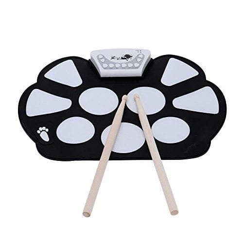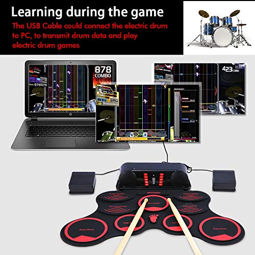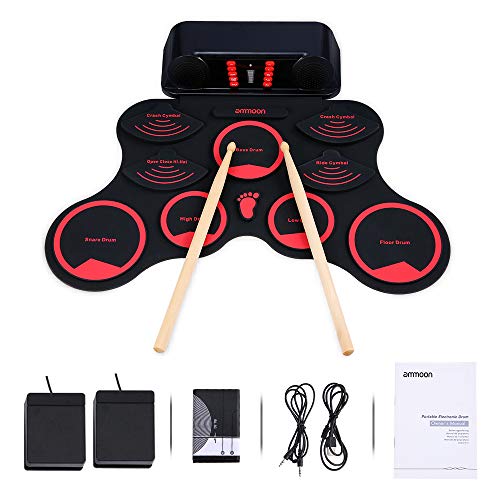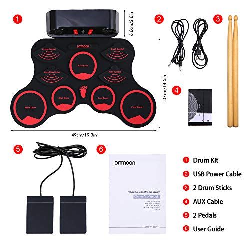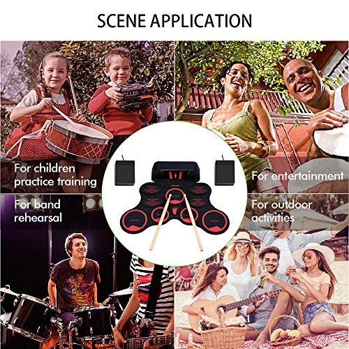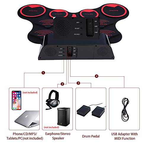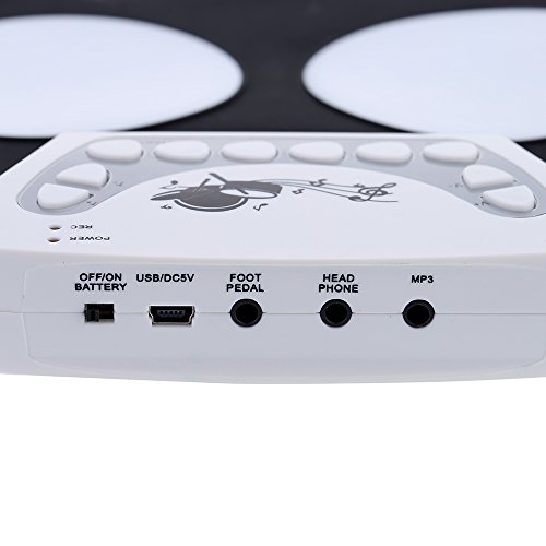 - ♫ Diseño humanizado: diseño enrollable / entrada de música auxiliar disponible / conector para auriculares de 3,5 mm / grabación / conexión USB-MIDI, diseño conveniente y portátil, puede tocar esta batería electrónica en cualquier momento y en cualquier situación, no se preocupe molestar a tus vecinos.