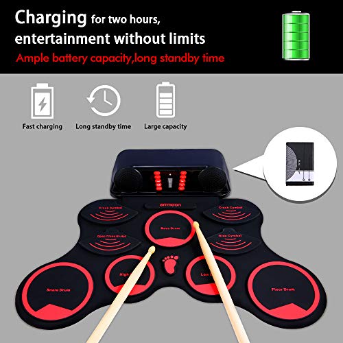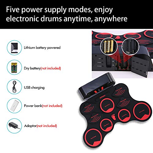 - ♫ Múltiples métodos de fuente de alimentación: conecte nuestro e-drum directamente a la fuente de alimentación / batería. Nuestro tambor electrónico se puede utilizar durante aproximadamente 4 a 5 horas después de que esté completamente cargado. Utilice nuestro tambor electrónico enchufándolo al banco de energía