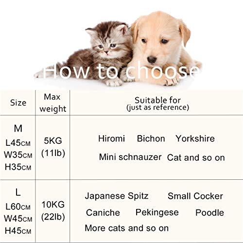 - 【2 DIMENSIONES】: M (45cm x 35cm x 35cm / 17.7in x 13.8in x 13.8in) recomendada para mascotas (perro pequeño y gato) <5kg, L (60cm x 45cm x 45cm / 23.6in x 17.7in x 17.7in) recomendado para mascotas (perros de tamaño mediano) <10kg. Este producto se puede usar en todas las estaciones.