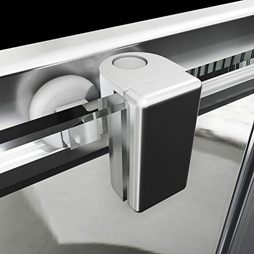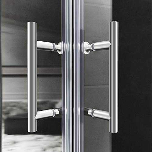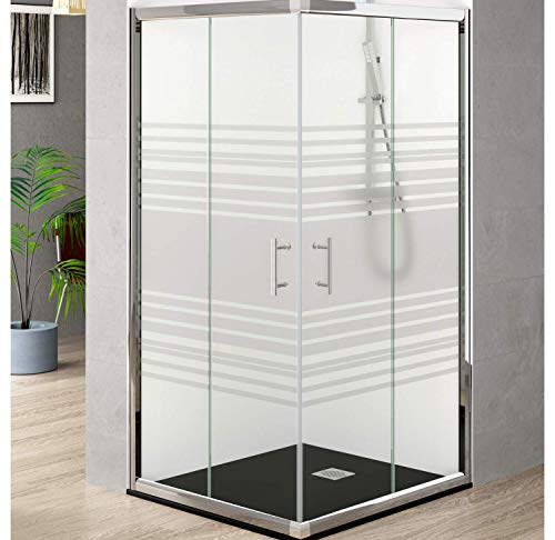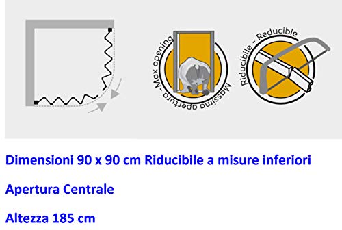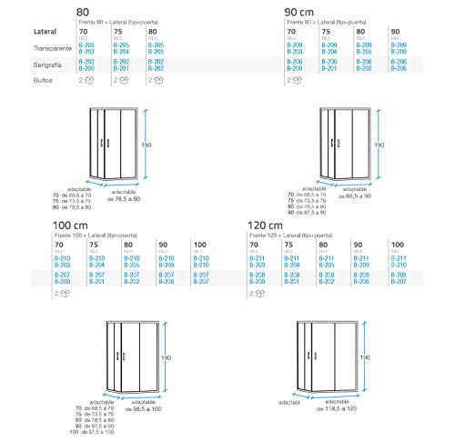 - Se adapta a todos los platos de ducha en las medidas entre 70 y 90 cm de ancho por cada lado; reducible con el simple corte del riel de desplazamiento graduado; altura 185 cm.