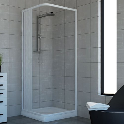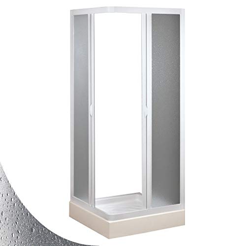 - Mampara de ducha 70x70 CM de PVC (cloruro de polivinilo: material reciclable, duradero y robusto) compuesta por 2 hojas fijas y por 2 puertas correderas. Paneles de acrílico de 2,2mm.