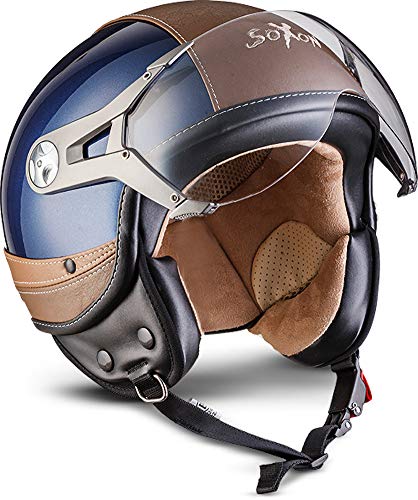 SOXON SP-325-URBAN Bobber Casco Demi-Jet Vespa Vintage Piloto Cruiser, S (55-56cm), Azul/Marrón