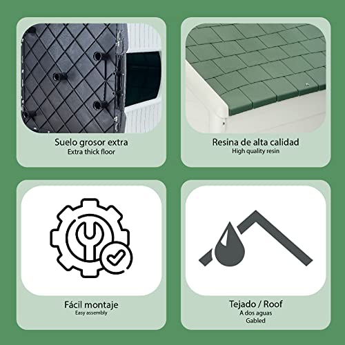 - GRAN ESPACIO DE ALMACENAMIENTO: Disfruta de un generoso espacio interior en esta caseta perfecta para almacenar lo que necesites de manera organizada y segura. Incluye suelo en color negro para asegurar la estructura. La resina permite imitar la madera otorgando una apariencia más encantadora