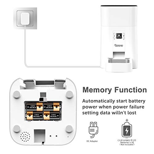 - Función de memoria:DADYPET dispensador comida gatos & perros funciona con un adaptador de corriente y 4 baterías de tamaño C(no incluidas). Comenzará la alimentación de la batería automáticamente cuando falla la alimentación, para asegurar que su mascota nunca se pierda una alimentación y que los datos de configuración no se pierdan.