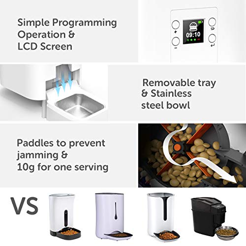 - Diseño de Estructura, Fácil de Limpiar: comedero perro el diseño de bloqueo superior y el panel de programa incorporado pueden evitar que las mascotas cambien la configuración con las patas y abran la tapa de la tolva para tirar la comida. Los tazones de comida extraíbles de acero inoxidable 304 de la FDA son fáciles de limpiar.