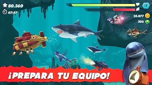 - Equipa a tus tiburones con artilugios y objetos especiales
