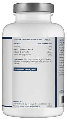 - ✅ CÁPSULAS DE CÚRCUMA DE ALTA DOSIFICACIÓN - Las cápsulas de Cúrcuma Intensiva de GloryFeel brindan una dosis muy alta por cápsula, 700 mg de cúrcuma original en polvo y 2,1 mg de extracto de Pimienta Negra - ¡Solo se necesita una cápsula al día, es pequeña y fácil de tragar!