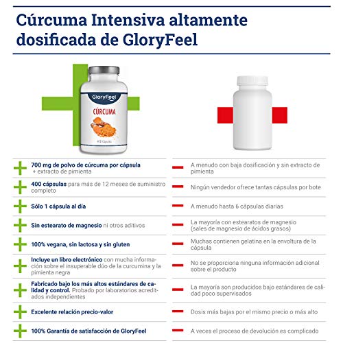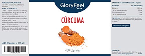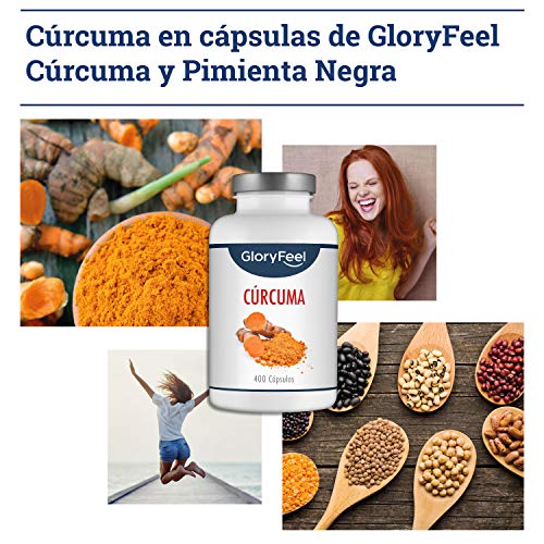 GloryFeel® Cúrcuma Intensiva - 400 cápsulas veganas para más de 1 año...