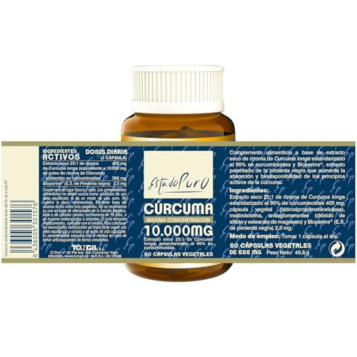 - CURCUMA ESTADO PURO10000mg se presenta en un tarro de vidrio ámbar reciclable con 80 cápsulas vegetales, es apto para veganos y no contiene alérgenos. Se recomienda tomar 1 cápsula al día que equivale a 380mg de curcuminoides