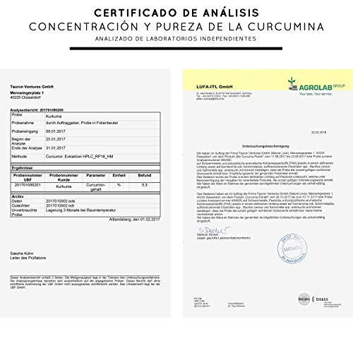 - TESTADO EN LABORATORIO EXTERNO, 100% VEGANO: Nuestras cápsulas de Cúrcuma han sido analizadas por un laboratorio acreditado. Realizamos análisis periódicos en laboratorios independientes acreditados para garantizar la máxima calidad del producto. Contáctenos para obtener más información, estaremos encantados de poder atenderte. Ingredientes no-GMO y sin ingredientes innecesarios, como estearato de magnesio, colorantes artificiales o edulcorantes. Sin gluten, lactosa ni soja.