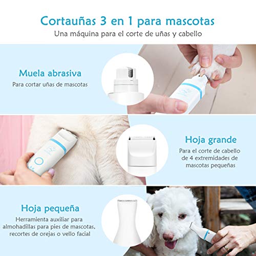 - [ MULTIFUNCIONAL 3 EN 1]: viene con 1 muela abrasiva y 2 cuchillas de afeitar para su reemplazo. La muela de calidad es segura y efectiva para cortar las uñas de las mascotas. La cuchilla grande adecuada para recortar el pelo de mascotas de tamaño pequeño y la cuchilla pequeña utilizada como herramienta auxiliar para almohadillas de patas de mascotas, recortes de orejas o vello facial. Un molinillo de uñas para mascotas para el corte de uñas y cabello.