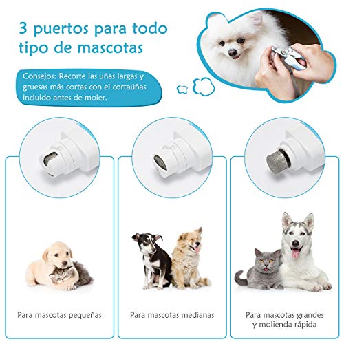 - [ 2 VELOCIDADES Y 3 PUERTOS DE RECTIFICADO]: un control clave. Simplemente presione el botón de encendido para comenzar a moler las uñas con velocidad normal. Presione nuevamente para alcanzar alta velocidad para el pulido de uñas largas y gruesas o el pulido rápido. Además, diseñamos puertos de 3 tamaños para satisfacer las necesidades de mascotas con diferentes tamaños.