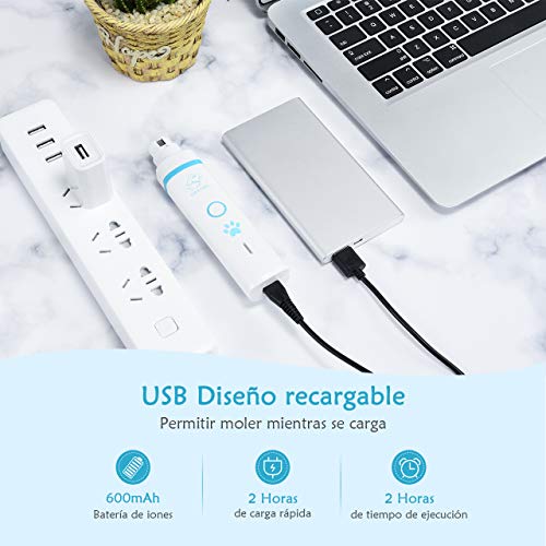 - [RECARGA USB]: La lima de uñas para perros puede funcionar continuamente durante 120 minutos con 2 horas de carga rápida. Además, permite moler mientras se carga, lo que significa que puede hacer un recorte para su perro en cualquier momento que lo desee. USB recargable por PC / Laptop, Adaptador de corriente, Banco de energía o toma USB. ¡No utilice un cabezal de carga con una salida superior a 5 V para cargar!
