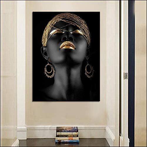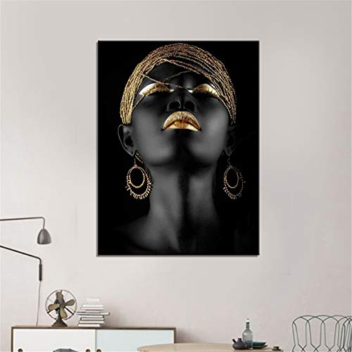 ZSLMX Arte De La Pared Impresa Lienzo Mujer Afroamericana Mujer Negra Pintura Modelo Moda con Labios Sexy Dorados Maquillaje En La Cara Ilustraciones para La...