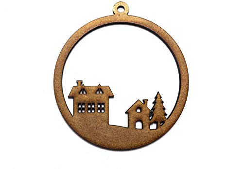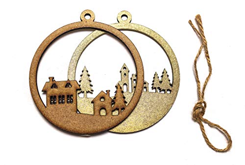 - Bola navideña que simula un paisaje navideño,compuesta por 2 troqueles de madera unidos por una cuerda. Uno de los troqueles está pintado de dorado y el otro troquel queda en madera .