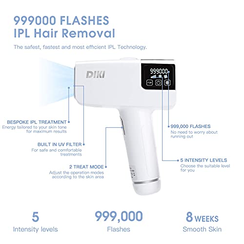 Depiladora de luz pulsada, DIKI IPL dispositivo de depilación permanente profesional 999,000 Destellos Compresor de hielo 5 niveles de energía 2 modos Pantalla LED,para cuerpo/cara/Bikini/axilas