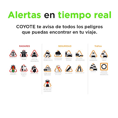 - UN ASISTENTE DE CONDUCCIÓN EN TIEMPO REAL: Coyote S es un asistente de ayuda a la conducción con cámara integrada que le muestra en tiempo real, los radares fijos, móviles, de tramo, de cinturón y móvil y de semáforo y las incidencias de la carretera reportadas por la comunidad, así como los límites de velocidad. Manténgase informado sobre el tráfico y conduzca con seguridad, disfrutando la mayoría de los servicios de Coyote.
