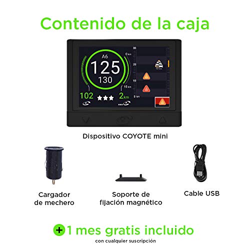 - ACTIVACIÓN Y SUSCRIPCIÓN: 1 MES DE SUSCRIPCIÓN incluida. Para utilizar el servicio, el Coyote Mini requiere una suscripción que puedes adquirir en la web oficial de Coyote España. De este modo, podrás disfrutar de todos los servicios de Coyote incluidas las alertas en tiempo real, tanto en España como en Europa