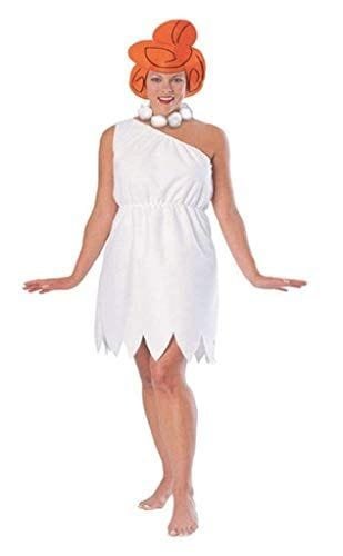 - INCLUYE: Este disfraz de Wilma contiene vestido blanco fabricado en poliéster, un tejido cómodo y resistente. Con hombro asimetrico y bajo en zig zag, además de cinturá elástica. Accesorio para la cabeza tipo tocado fabricado en fieltro moldeado con detalles. También incluye joyas de collar de plástico de gran.