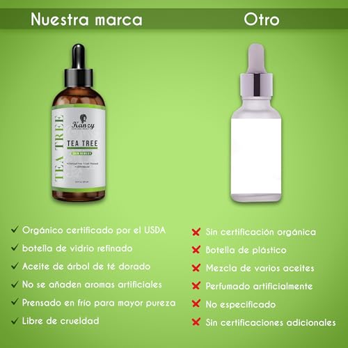 - El aceite árbol de té Kanzy orgánico, natural, sin refinar, sin químicos y sin filtrar es un líquido transparente de color amarillo verdoso con un aroma fuerte, fresco y cálido, ideal para usar en problemas de la piel