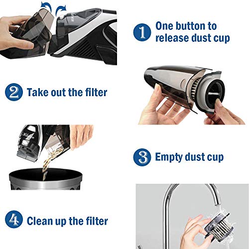 - 【Fácil de Limpiar】El contenedor del polvo de esta aspiradora de mano capacidad 0.6L,vaciar con sólo apretar un botón.El filtro HEPA de acero inoxidable que se puede lavar en agua.En comparación con los filtros con bolsa convencionales, somos más duraderos.