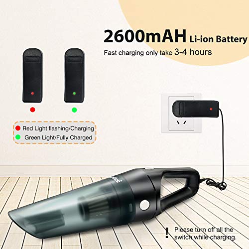 - 【Larga Duración】La aspirador de mano sin cable con capacidad de batería de 2600mAh, funciona 25-30 minutos después de la carga completa, con la tecnología de carga rápida, solo necesita 4-5 horas para cargarse completamente