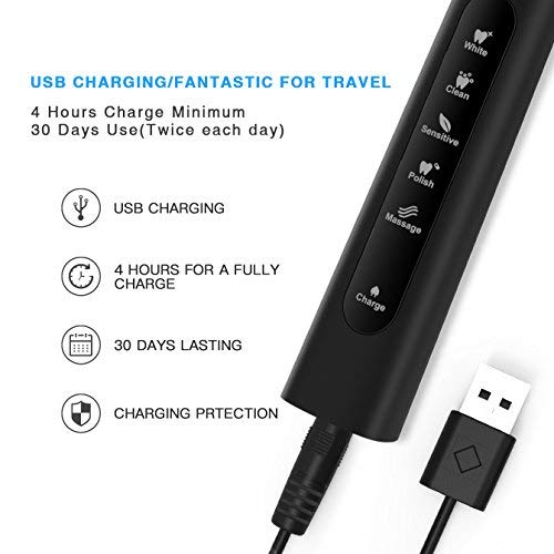 - BATERÍA A LARGO DURACIÓN Y CARGADO USB: una recarga por casi 30 días de empleo.Cepillo de dientes recargable puede ser cargado por espina portátil y powerbank. Potencia de larga duración y múltiples modos de recarga por viajes y viajes de negocios.