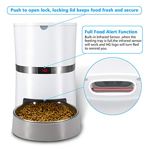 - 【Diseño Único con Inversión de Motor y Detección por Infrarrojos】Este comedero fue creado con un diseño único de inversión de motor para prevenir el bloqueo de comida; sensor de infrarrojos incorporado para alertar que el recipiente de comida está lleno, cosa que también hará que el logo "HG" comience a encenderse en color rojo para avisarle.Por favor lea el aviso amarillo que se encuentra en la tapa del comedero, después de leer las instrucciones y entonces proceda a configurar el dispositivo.