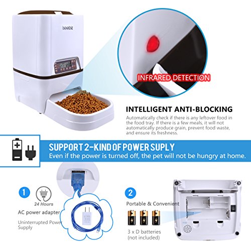 - 【Grabación de Audio, Baterías y Conexión USB】Este dispensador de comida automático lleva incorporado un grabador de voz y un altavoz con el que podrás llamar a tu mascota para comer durante 10 segundos; Soporta baterías 4 D o cable de alimentación DC, en el interior del paquete encontrará un adaptador de corriente DC y un cable.