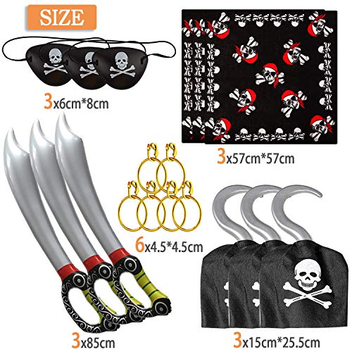 - Tamaño: espada pirata inflable 85cm / 33.46 pulgadas, parches oculares pirata 6 x 8 cm / 2.36x3.14 pulgadas, bandana pirata 57x57cm / 22.44x22.44 pulgadas, 1 gancho pirata 15x25.5cm / 6X 10 pulgadas, pendiente pirata 4.5cm / 1.8 pulgadas en diámetro