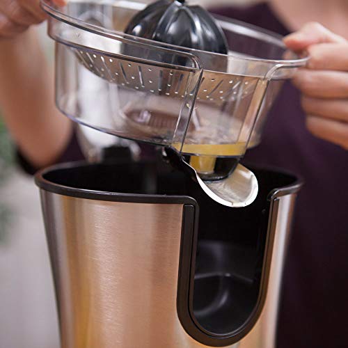 - Exprimidor eléctrico para naranjas y cítricos con 40 W de potencia. Filtro de acero inoxidable, más fácil de limpiar y apto para lavavajillas.