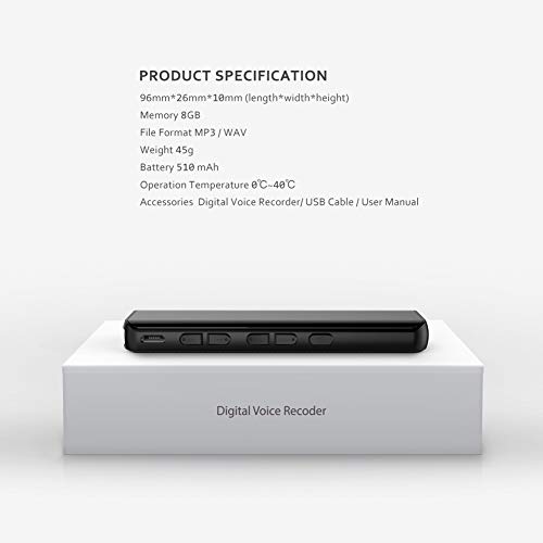 - 【Grabación de larga duración】 Con 8 GB de espacio de almacenamiento ultra, puede almacenar audios de 12 horas a 580 horas. La longitud cambiará con diferentes niveles de calidad de sonido, como 1536 KBPS / 512 KBPS / 256 KBPS / 128 KBPS / 32 kbps. También incluye una batería de 510 mAh con un período de espera máximo de 60 horas.