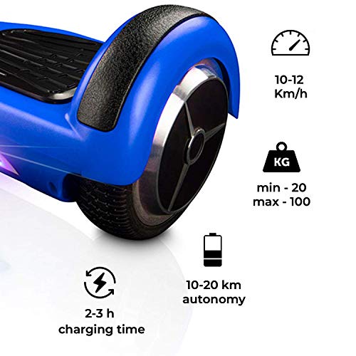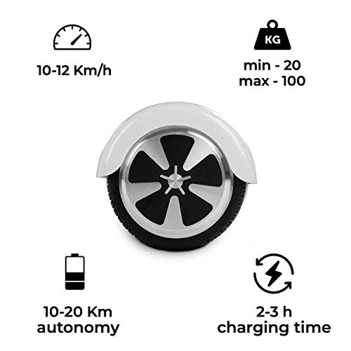 - Con una velocidad máxima de 12 km/h, es perfecto para moverte por la ciudad con rapidez y facilidad. Dispone de 2 motores independientes de 250 W. Su batería de litio recargable de 4.0 Ah -con certificado UL y carcasa protectora ignifuga- permiten una gran autonomía: 10-20 km. Su indicador de carga y encendido te avisará cuando se esté agotando para que recargues tu patinete -hover- eléctrico… ¡Y puedas seguir disfrutando!