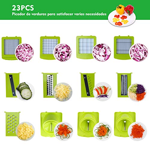 - 23 piezas, multifunción: Esta mandolina de verduras contiene 12 cuchillas y ellas se pueden reemplazar. Los trozos gruesos y finos, las rajas espesas y sencillas, los filiformes y los floridos se pueden cortar libremente. También incluye una serie de accesorios razonablemente interesantes, como un protector de mano para evitar el corte de la herida, una cuchilla (tenedor) para limpiar, un cepillo y un pelador. Satisfaga su corte de varias formas de frutas y verduras mientras protege sus manos.