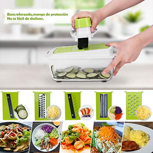 - 【7 IN 1 MANDOLINE COCINA】Verduras mandolina utilizados para el corte en rodajas, la trituración, troceado, corte en dados, incluye una variedad de opciones de grueso y delgado corte en lonchas, fino y grueso, opciones de rejilla y de trituración. Se aplica a casi todas las frutas y verduras. Por ejemplo: calabacines, pimientos, cebollas, rábanos, pepino, queso y otras hortalizas, limón, manzana y etc. 【7 CORTES A TU ELECCIÓN】 Cortes perfectos con diferentes espesores; diferentes cuchillos con los que puedes seleccionar el más adecuado para lo que vas a preparar el patio. No es lo mismo saltó para traer algo al plato. Todos tienen cuchillas afiladas con un borde fino de forma rápida y fácil de cortar, accesorios ricos medio reducen el tiempo de preparación y hacen que los platos más fácil. Es un regalo perfecto para las mamás, los chefs y las personas conscientes de la salud, haciendo que co. 【GUARDAR ESPACIO】 Cuchillas de corte intercambiables y fáciles de usar. Para agarrar fácilmente comidas recién preparadas, ayudando a retener más fruta o verdura carne, conservar los nutrientes y frescura, transparente chopper caja de verduras con tapa, también puede ser utilizado como un contenedor. Además, este corte de verdura es ideal para acampar o tomar vacaciones. ¡Te Encantará! 【DISEÑO DE PROTECCIÓN DE USUARIO】 Máquina de prensado manual diseñada para cuidar sus manos. Funcionamiento seguro con los pies de goma y protección para los dedos para una mayor estabilidad en la superficie de trabajo. (Consejo: la cuchilla es muy filosa, lejos de los niños. Muy cuidadosa al lavarla). Un regalo perfecto para las mamás y los cocineros. y personas conscientes, haciendo que sus vidas en la cocina sean más divertidas y fáciles. 【PLÁSTICO SIN PELIGRO】 Buena calidad, libre de BPA, plástico ABS seguro para alimentos, nuestra mandolina tiene un diseño especial, no tiene extremos sin salida, por lo que es muy fácil usar agua caliente con jabón para limpiarla y prepararla para otro uso. no se oxida ni pierde su claridad cuando se usan procesos y envoltura. Para que nuestros hijos y nuestras familias brinden buenas condiciones, ¡es preferible para todos los cocineros!