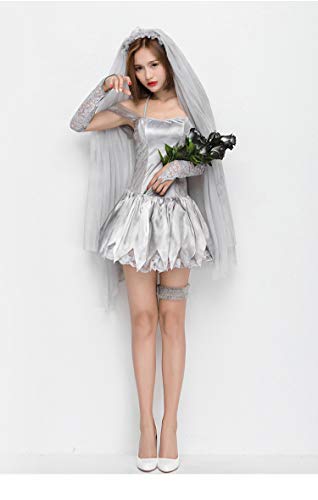 - Incluye Disfraz de novia zombi hasta que la muerte nos separe, con vestido, velo y ramo
