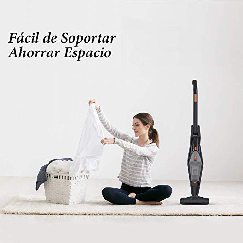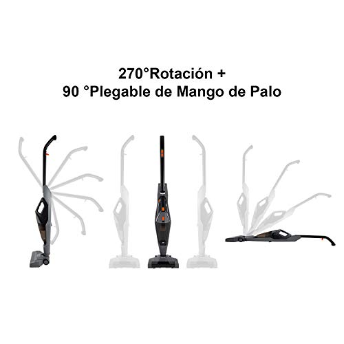 - Aspirador Ciclónico 2 en 1: Aspirador escoba y aspirador de mano, con 15Kpa de poderosa succión, proporciona una aspiración eficiente en suelos de madera, azulejos y mármol. También puede usarlo para limpiar el sofá, la mesa o la grieta sin el polo de extensión en modo de mano.