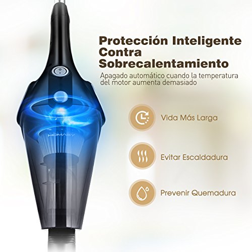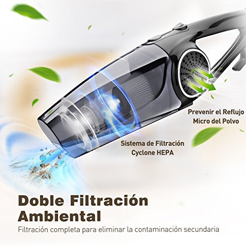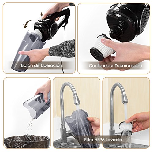 - 【Fácil de Limpiar】El contenedor del polvo de esta aspiradora de mano capacidad 0.6L,vaciar con sólo apretar un botón.El filtro HEPA de acero inoxidable que se puede lavar en agua.En comparación con los filtros con bolsa convencionales, somos más duraderos.