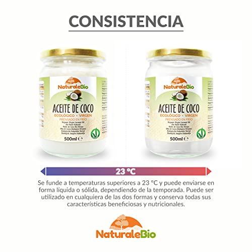- AROMAS y CONSISTENCIA: El aceite de NaturaleBio tiene un olor suave y agradable de coco. Se funde a temperaturas superiores a 23 grados y puede enviarse en forma líquida o sólida, dependiendo de la temporada. Puede ser utilizado en cualquiera de las dos formas y conserva todas sus características beneficiosas y nutricionales.