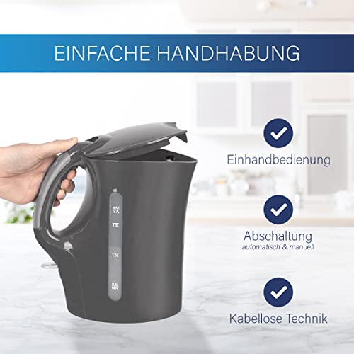 1 Clatronic WK 3445 – Hervidor de agua (1,7 L, 2 indicadores de nivel de agua exteriores, elemento calefactor de acero inoxidable), color gris