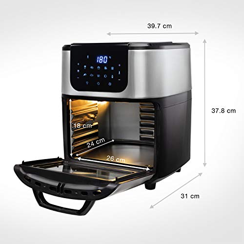 - Accesorios incluidos: el horno freidora viene equipado con 1 cesta para patatas fritas giratoria y su asa, 3 rejillas de cocción, 1 pincho para asar y su asa