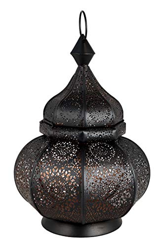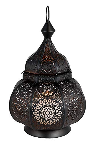 - Farola de jardín marroquí colgada o de pie, de color negro por fuera y de color cobre por dentro, diseño iridiscente que atrapa la luz de las velas y la refleja para un hermoso efecto, las perforaciones evocan sombras orientales en su habitación.